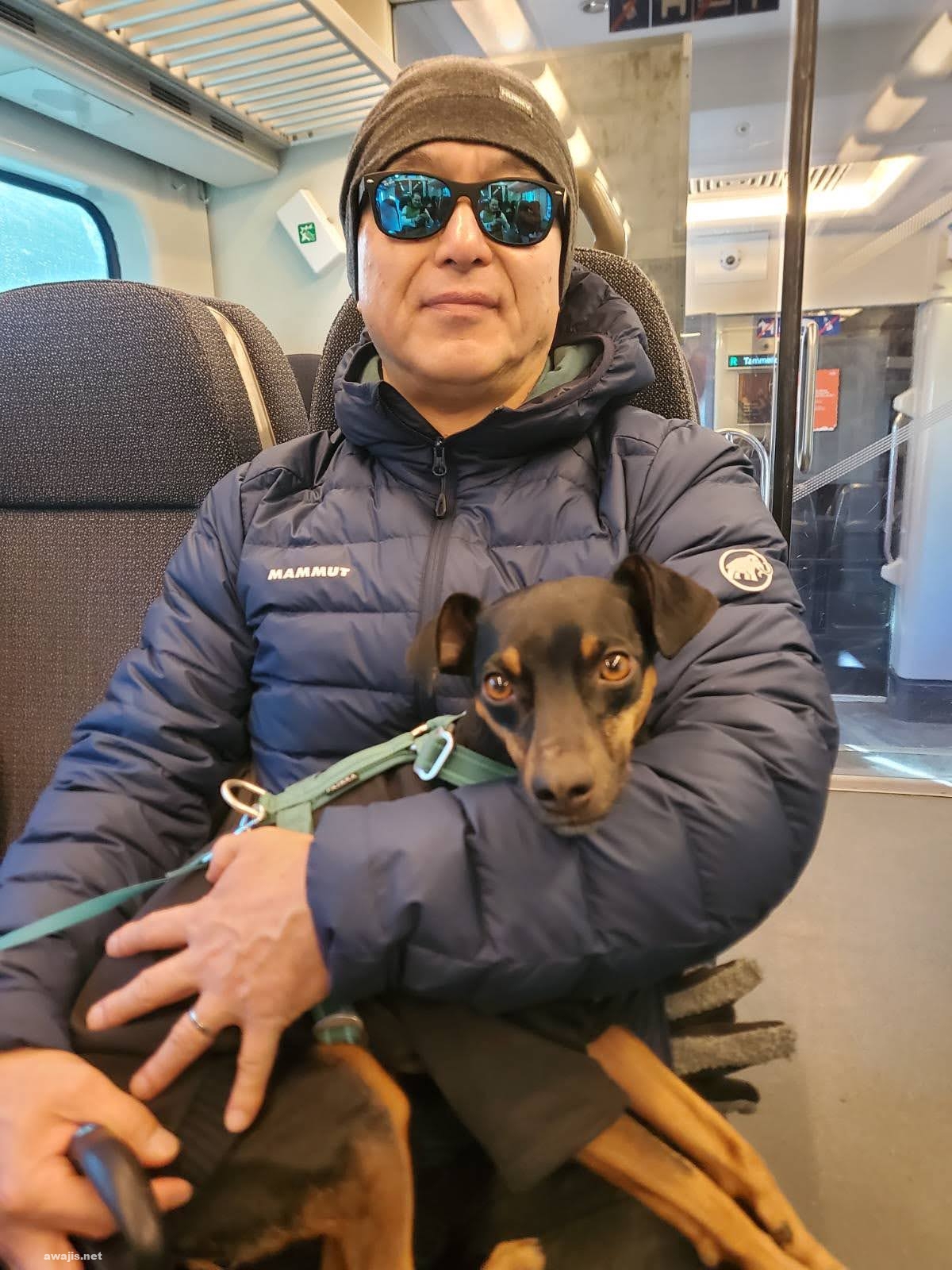 写真は、朝の通勤列車内で、ワンコのLewisと。
