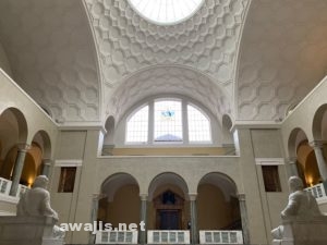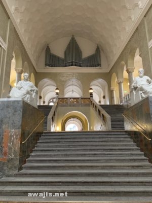 日本の大学には滅多にない、歴史を感じさせる建物の重厚な木のドア開けると、高い天井のホールと、広い階段。その奥の階段を下ったところに、結構な広さの部屋が記念館になっていて、資料や説明のパネルが展示されています。