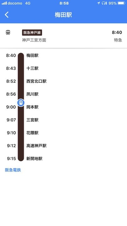 Google Mapsから時刻表を呼び出すと、電車アイコンで現在地を表示してくれるのは気づきませんでした。しかもリアルタイムで移動する芸の細かさ。