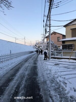 思った通り、最寄り駅までのバスは運休で、皆歩いてました。まるでウォーキング・デッド。おそらく、写真に写っている難所の坂が上れないための運休だと思います。
