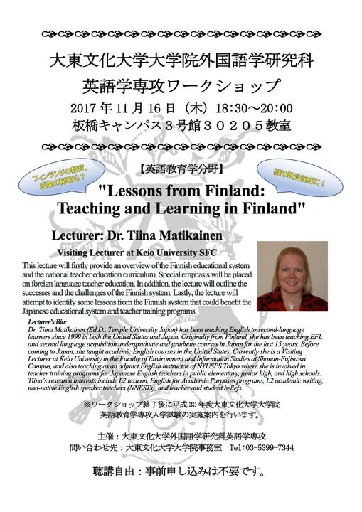 明後日の16日(木)午後6時半より、大東文化大学板橋キャンパス3号館30205教室で、Tiina Matikainenさんを招いて講演会を行います。どなたでも参加できますので、是非お運びください。