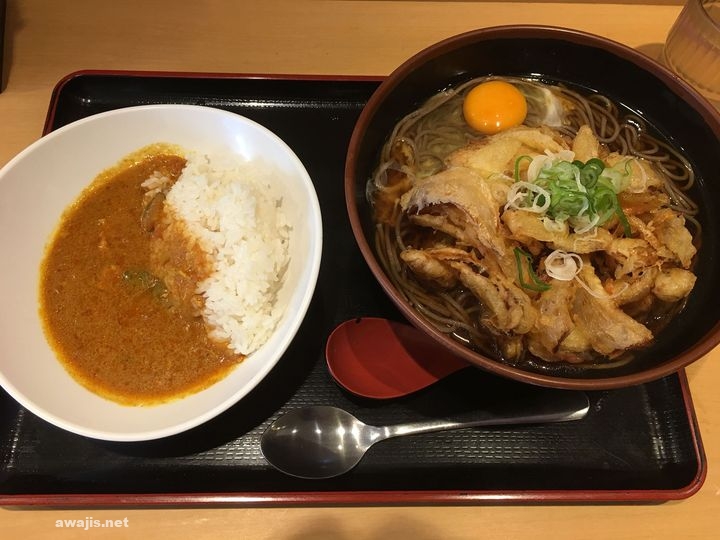 最近話題(?)の、よもだそばにて、特大かき揚げそばプラスよもだ半カレーに、生卵を落として。トマトの酸味にピリッとスパイスの効いた美味しいカレーでした。