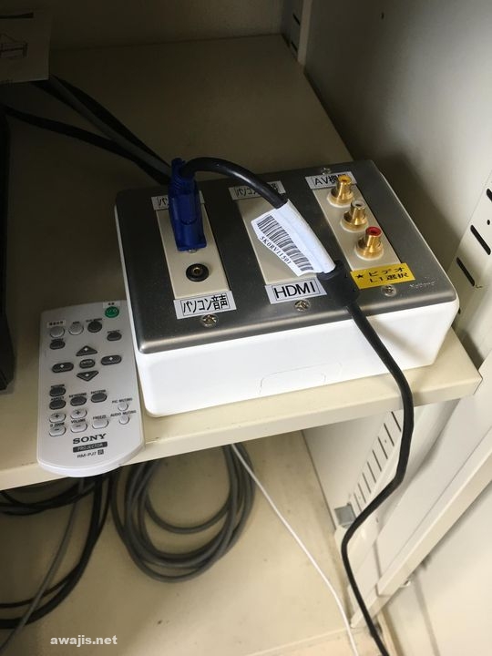 プロジェクタへの接続口が、スチール棚の中に、コロリと収められ、ケーブルはかろうじてD-sub15が用意されてるけど、音声ケーブルがない。