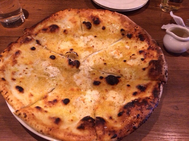 調子に乗って、クアトロフォルマージも注文。半分は素のまま、残り半分はハチミツをかけていただきました。