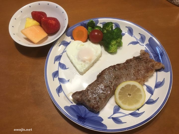 帰りにスーパーでステーキ肉を買い求め、ステーキディナーフルーツ添えをご提供。