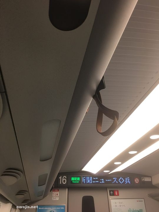 網棚に上げた荷物の安全策として、肩掛けを出してぶら下げて見やすくしておく。