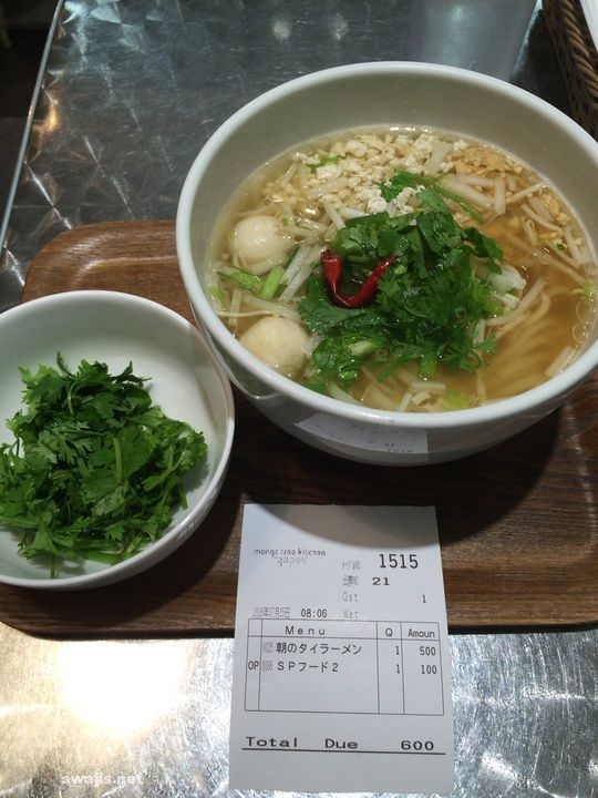 あーあ、とうとう。。。 東京駅グランスタのマンゴーツリーで朝限定で供されているタイの汁そば、パクチー大盛が有料化!という衝撃の知らせ。 「多めですか?大盛りですか?」 「どう違うんですか?」 「大盛りは100円になります。」 ってやり取りからして、多めは引き続き無料の模様。 でもさすが有料だけあって、これまでの2.2倍(当社比)。