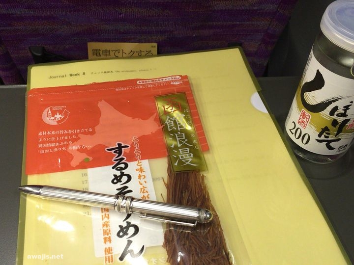 終わらなかった授業準備を持ち帰り、電車内で片付けるべく、グリーン券奮発。テーブルがあるのとないのでは大違い。添削がはかどる水飲みながら鋭意添削中。なぜか鞄からはイカソーメン。