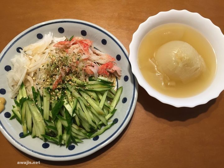 昼頃まではまだうららかだったので、本年の初冷やし中華。淡路島から送ってくださった新タマネギをのせました。それと、朝作っておいた新たまを丸ごとコンソメで煮込んだもの。温め直さず、冷静でも美味しくいただけました。