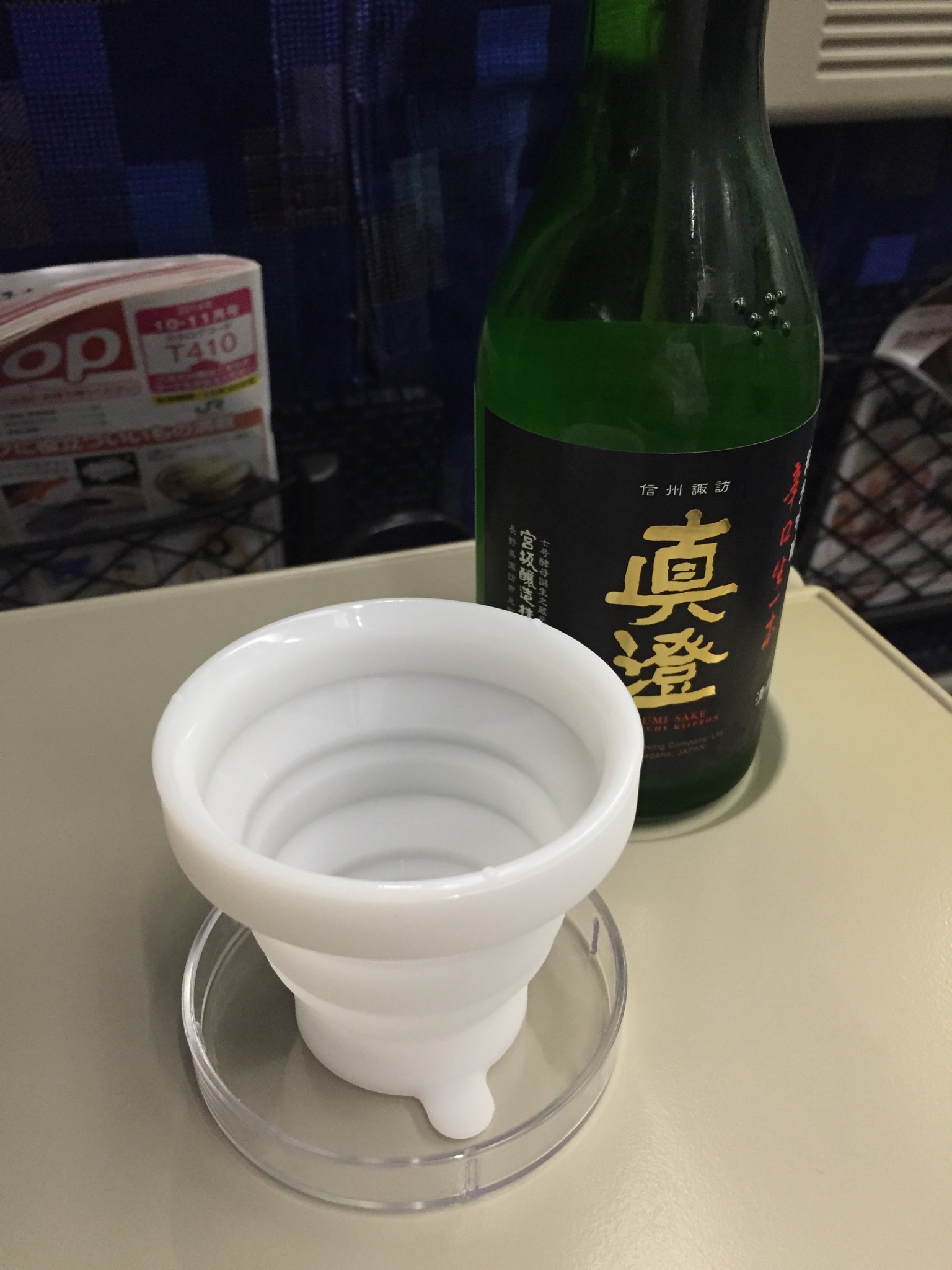 今日の主役は、真澄純米吟醸辛口生一本300ml入り瓶ではなく、手前の携帯コップ。