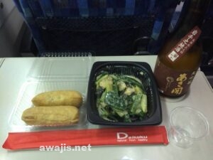 今日のふくべは満員で入れず、デパ地下のつまみと酒で、ホームライナー晩酌号。