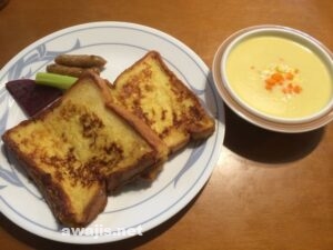 娘のリクエストで、朝食には頑張ってフレンチトーストもサービス。コーンスープは、昨夜から仕込んでおいたもの。