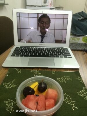 研究室でのひとり弁当は淋しいので、今日はこの人と食べました。 デザートは、スイカ、マンゴー、チェリーとブドウ。