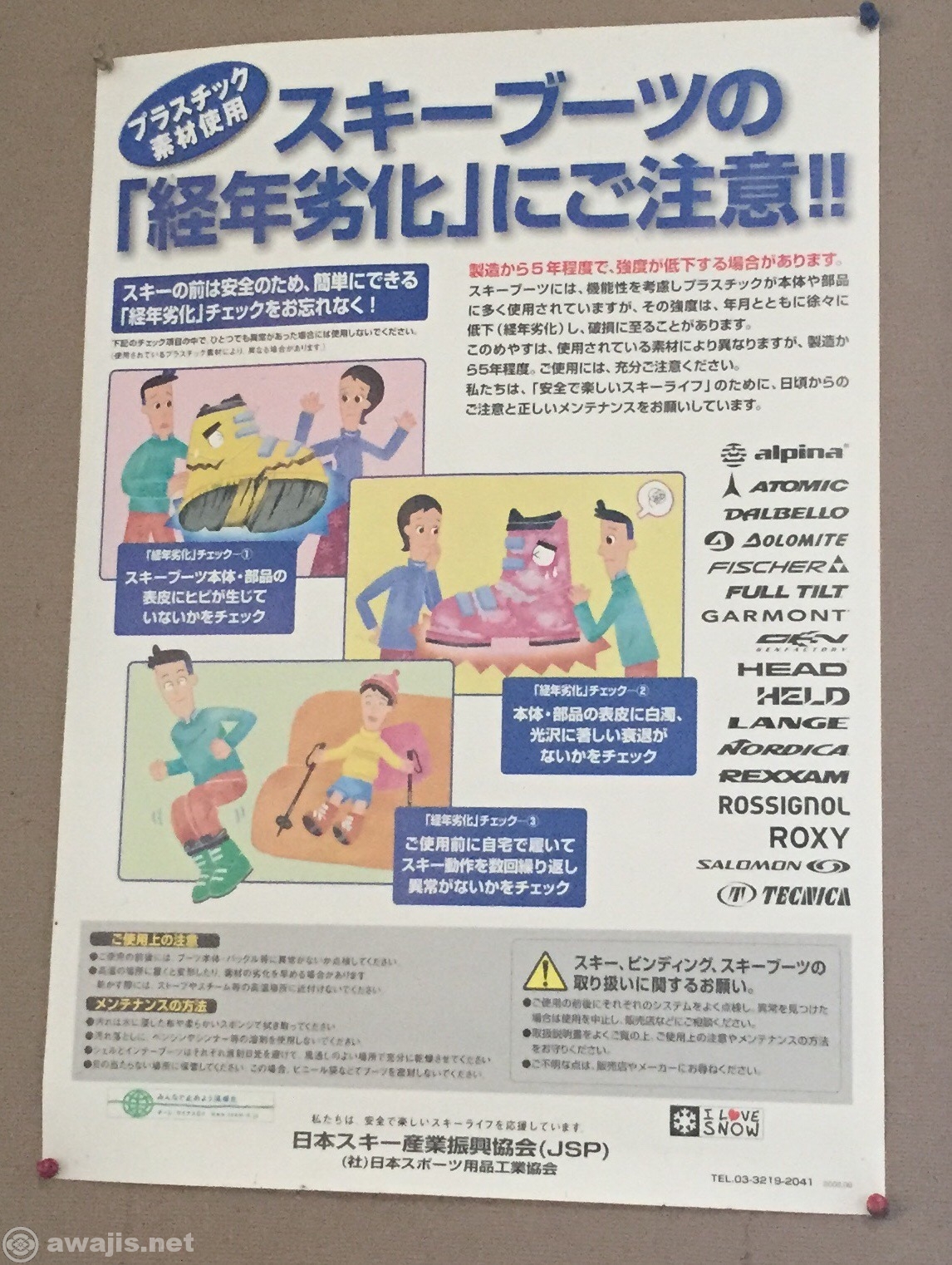 昼飯とったレストハウスには、経年劣化によるブーツ破損注意を呼びかけるポスター。