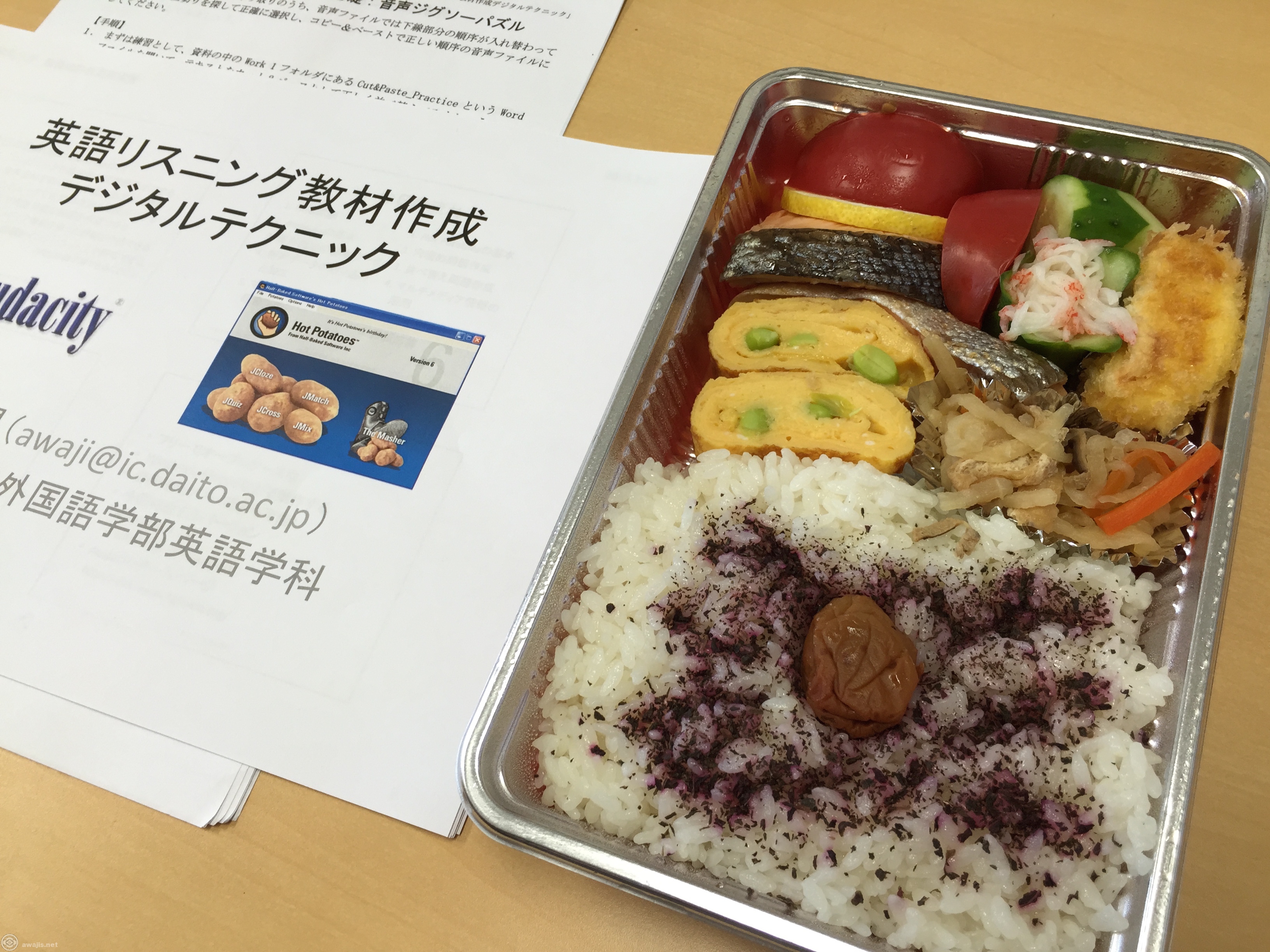 今日は昼飯に出る間も惜しんで仕事しないと終わらないという見通しのもと、奥さんの弁当を作るついでに、自分の弁当も用意。愛用の弁当箱ではデモ参加の荷物になるので、使い捨ての弁当箱で調製。何とか教職免許更新講習の教材の準備は終えることができました。