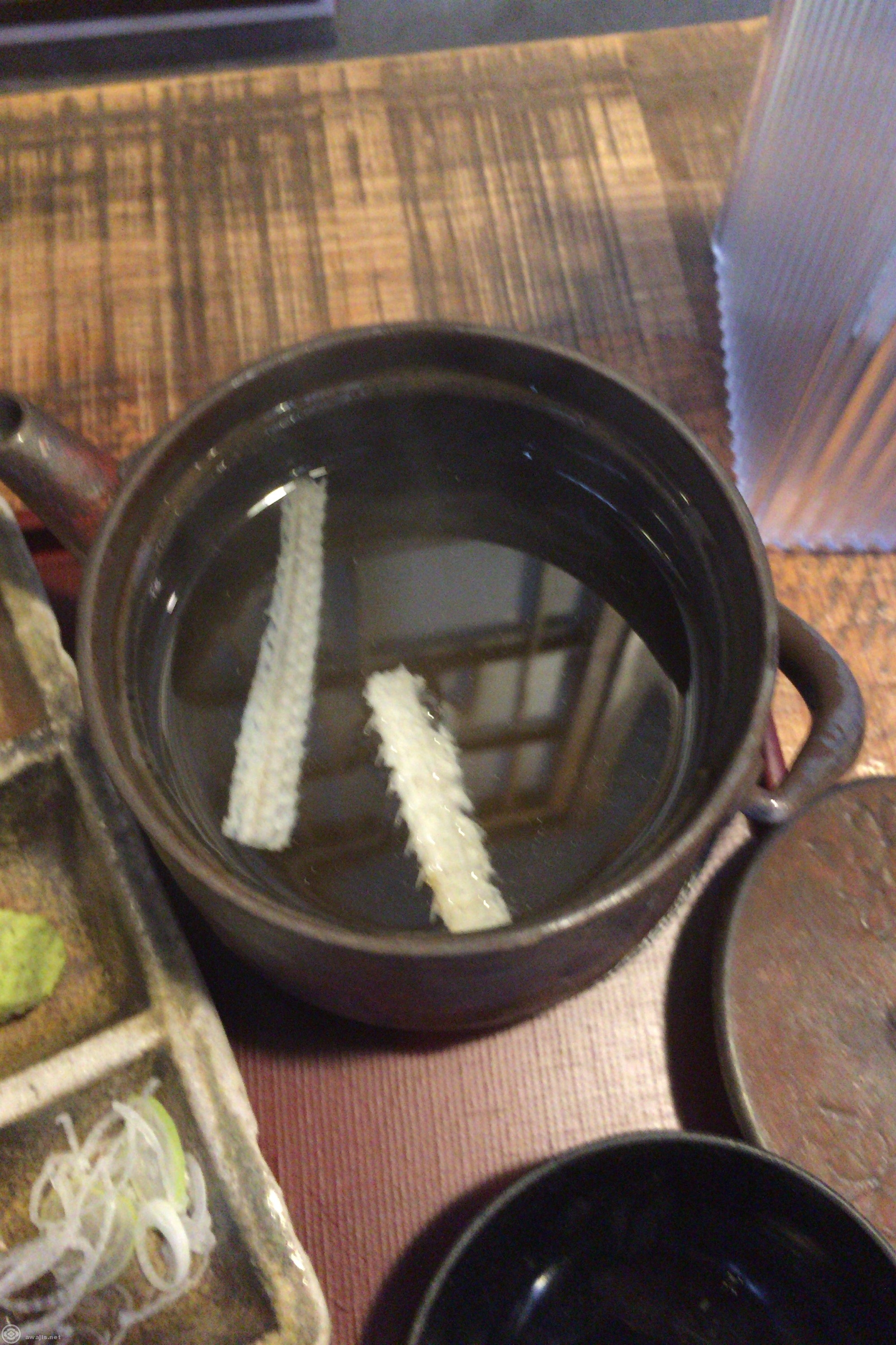 仕上げの茶漬けの段になったら声かけると、小さな鉄瓶に熱い出しを入れてくれます。野暮ったく蓋を開けて中を覗くと、穴子の背骨が二本入っていました。