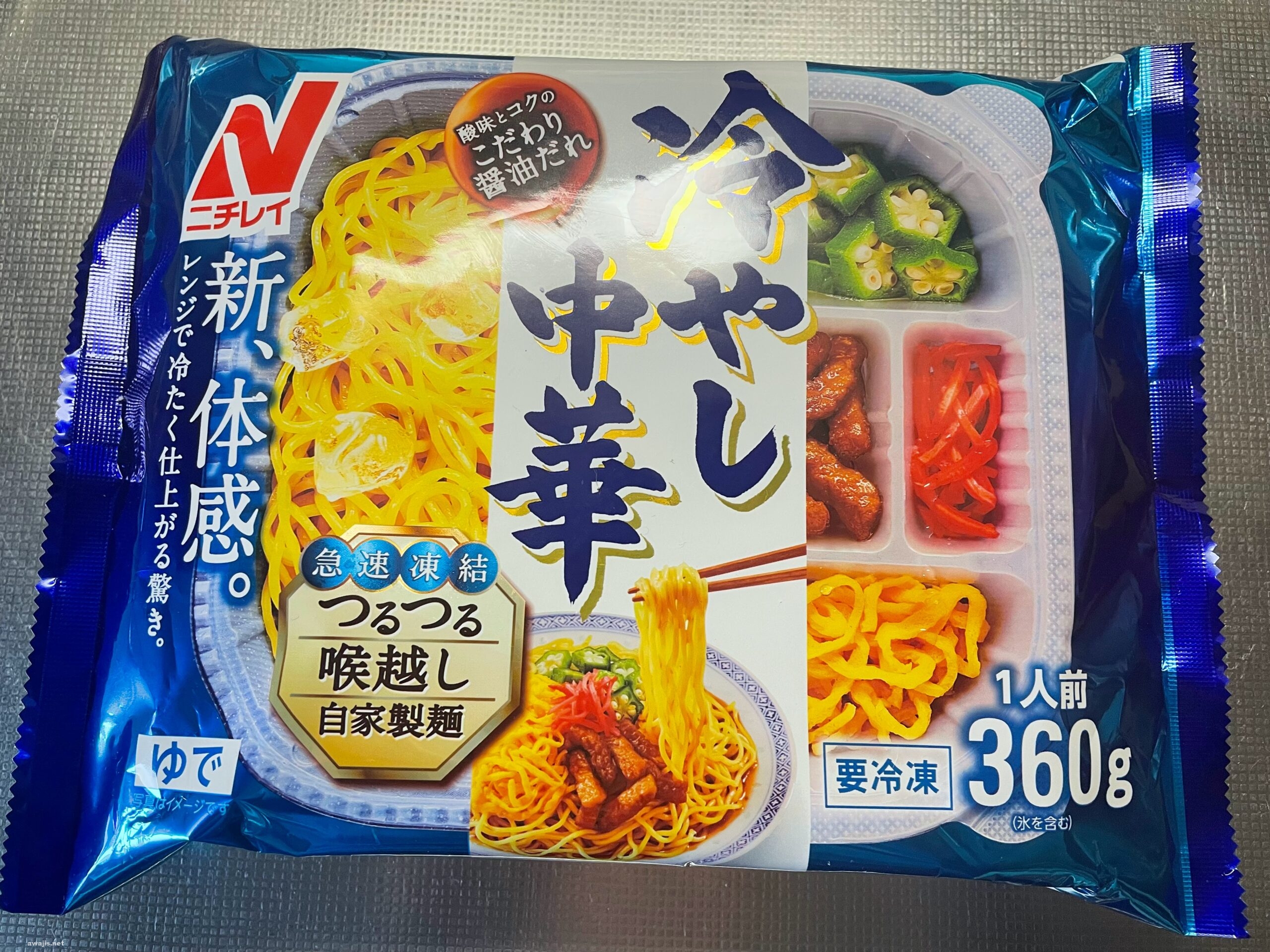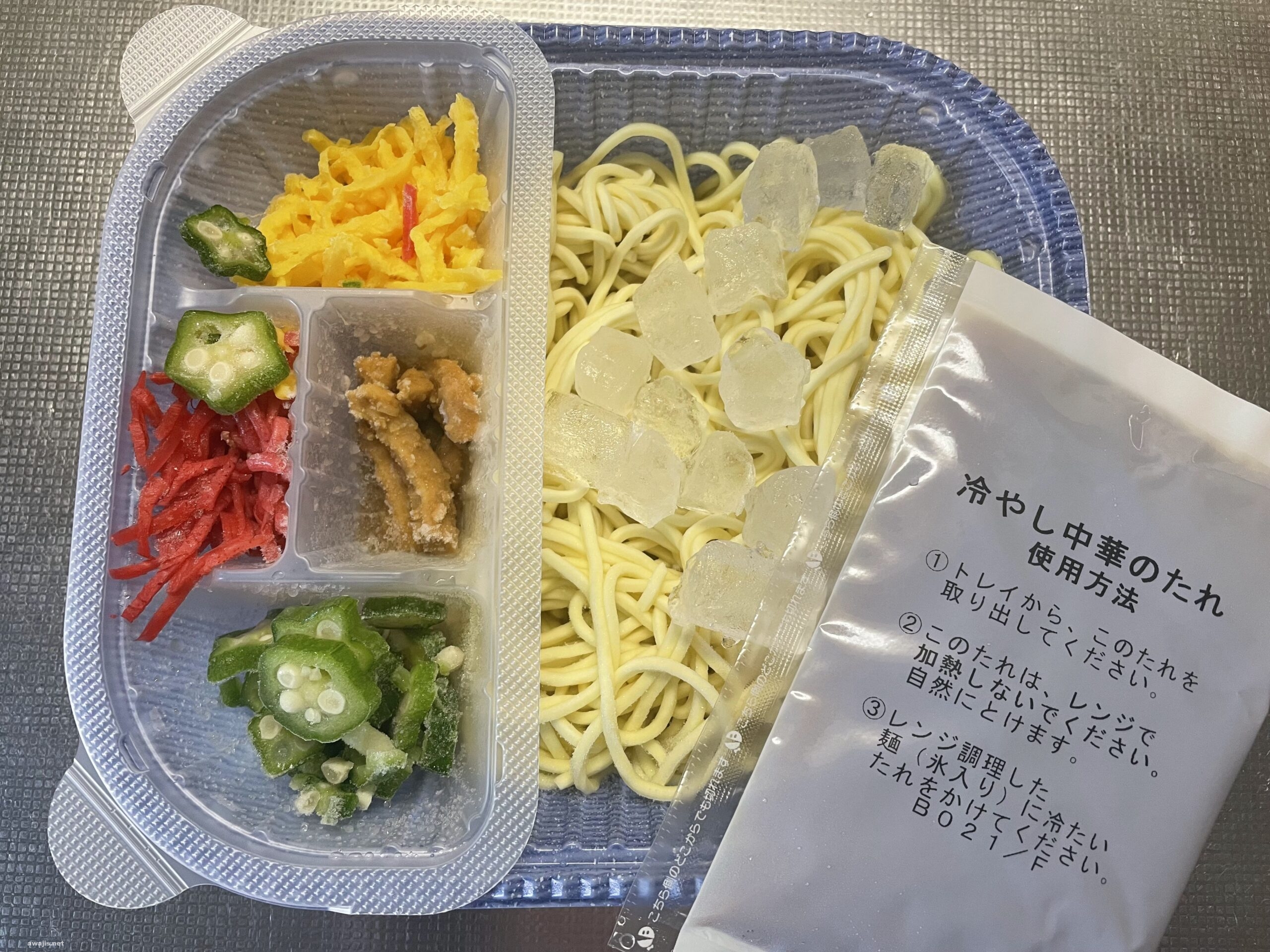 冷え冷えに仕上がる秘密は、冷凍麺の上に見える氷。レンジで麺を解凍すると、この氷は解けずに残る仕組み。箸で麺をほぐして氷で冷やすひと手間はかかりますが、麺を茹でるよりはるかに手軽。