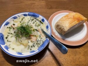 じゃがいも、玉ねぎ(ニンジンを入れても可)を適当な大きさに刻んで茹で、そこにバターで軽くソテーしたサーモンのフィレブロックを投入。サーモンに火が通ったら、生クリームを入れて少し煮込み、仕上げに細かく刻んだディル(フィンランド語ではtiili)を入れ、塩胡椒で味を整えて出来上がり。