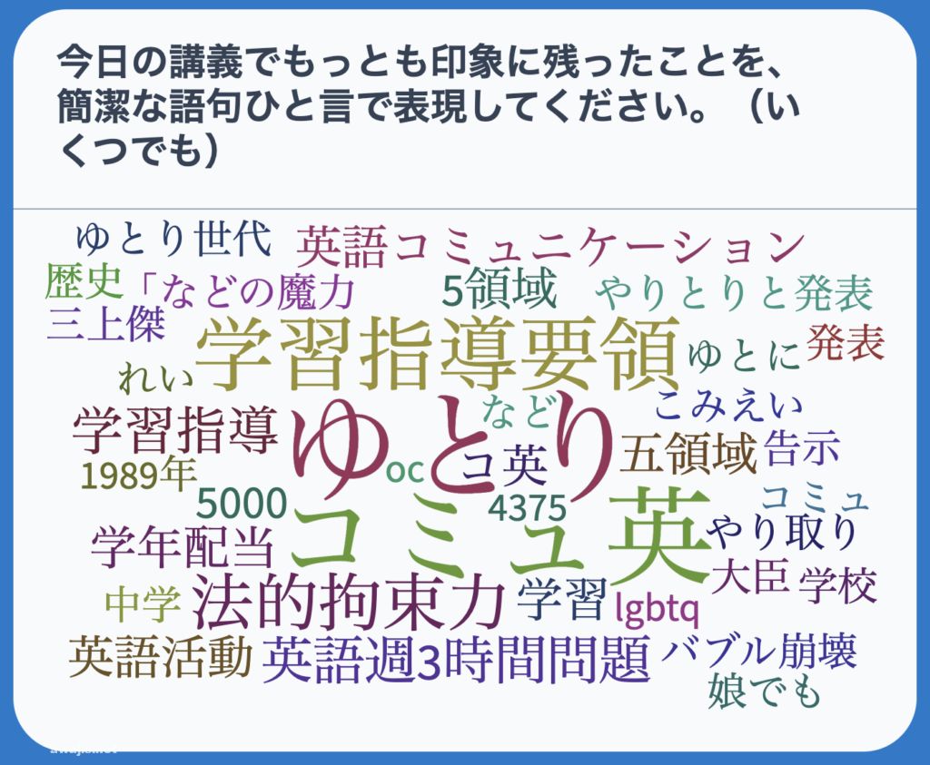 画像は、最後に講義について印象に残っていることをフレーズで答えてもらったもの。学生が回答すると同時にスクリーンに語句が表示され、多く投稿されたものが大きく表示されるようになっている。意味不明なふざけたものもちらっとあるが、おおむね話した内容に関するもので、学生の印象に残ったことがうかがえる。