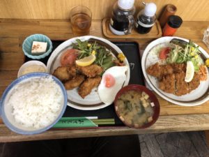 実は、個人的にはあじフライとカキフライ、可能ならそれにコロッケなど加えて楽しめるミックスフライ定食のようなものを想定して暖簾をくぐりました。でも、そういうメニューは発見できず、勢いで「あじフライ定食に、単品でカキフライ定食つけられますか?」って口をついて出ちゃいました。お店の人も若干躊躇していましたが、無事料理が供され、その瞬間、完全に食い過ぎだと判明しました。