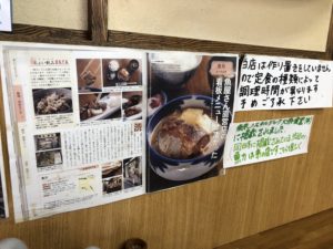『東京ノスタルジック食堂』という本で紹介されたページのコピーが壁に貼ってありました。隣にはやはり同じ本に載った弟さんの店の記事が出ていましたが、ここはかつて大学院生時代にNHKでリサーチャーのバイトしていた頃、よく行った店です。