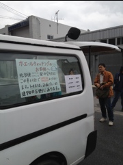 那覇を出て北上し、しばらく車を進めると北谷(ちゃたん)という港町に。そこで国道からそれ、港に向かうとホエールウォッチング受付のワンボックスカーが駐車場に止まっていました。綺麗とはいえないワンボックスカーの後ろで、カレンダーの裏紙かと思うような紙にマジックで手書きされた案内とお品書きで商売、怪しい雰囲気。