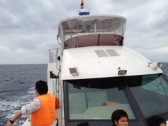 出航すると、のっけから荒波にもまれ、ものすごい揺れ。十分もしないうちに、別の若者グループの一人がダウン。その後また一人、そしてまた一人と、通称キタロウ袋(ゲゲゲの、ね)を手にうずくまる。同船していた黒人親子のお父さんがフラフラしながら船尾に出てダウン。心配そうに見守る奥さんに「旦那さん、海軍じゃないみたいね」ってどうでもいい冗談。