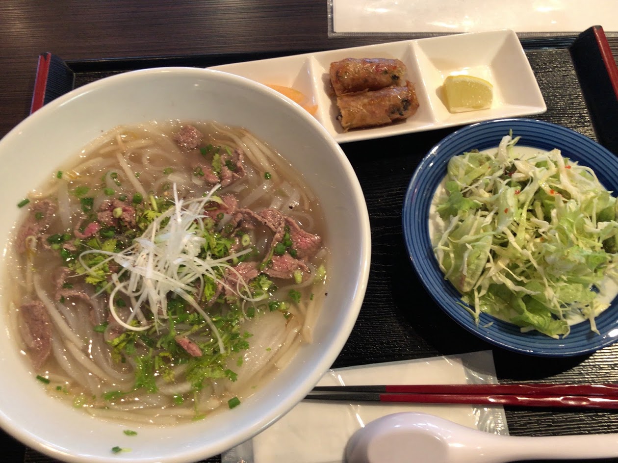 注文したのはphở bòのセット850円、サラダ、揚げ春巻き、デザート付き。ランチのセットはすべて850円。日替わりは、厚揚げとトマトのチリソースだったか。フォーは薄味ながら、化学調味料に頼らぬ味はいいけれど、ライムの代わりにレモン、香草があまり入ってないのがちょっと不満。言えば出してくれそうな感じ。