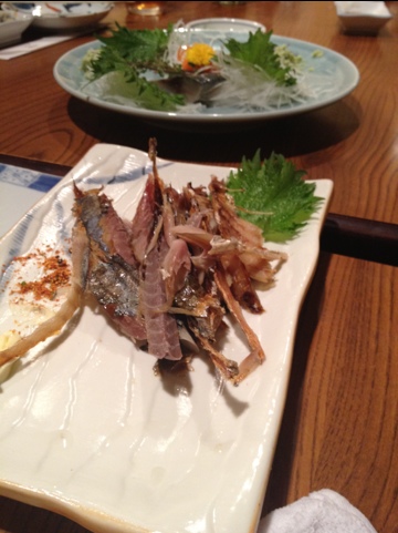 なかなか自宅では焼くのがはばかられる強烈な香りですが、ここなら美味しく焼いて、おまけにほぐして出してくれます。同僚のM氏が一緒だと猛烈な反対にあって注文できないのですが、この日はくさやオッケーな人ばかりでラッキー。