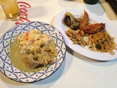 取りあえず料理に向かっていくと、パッタイ、グリーンカレー、炒め物三品、手羽の唐揚げ、春雨サラダ、そしてなぜかキャベツの千切り(これって、手羽の付け合わせだったのかも)。デザートはタピオカ。ドリンクは、ホット&アイスのコーヒー、お茶。オプションでドリンクやトムヤムクンなども追加可能。