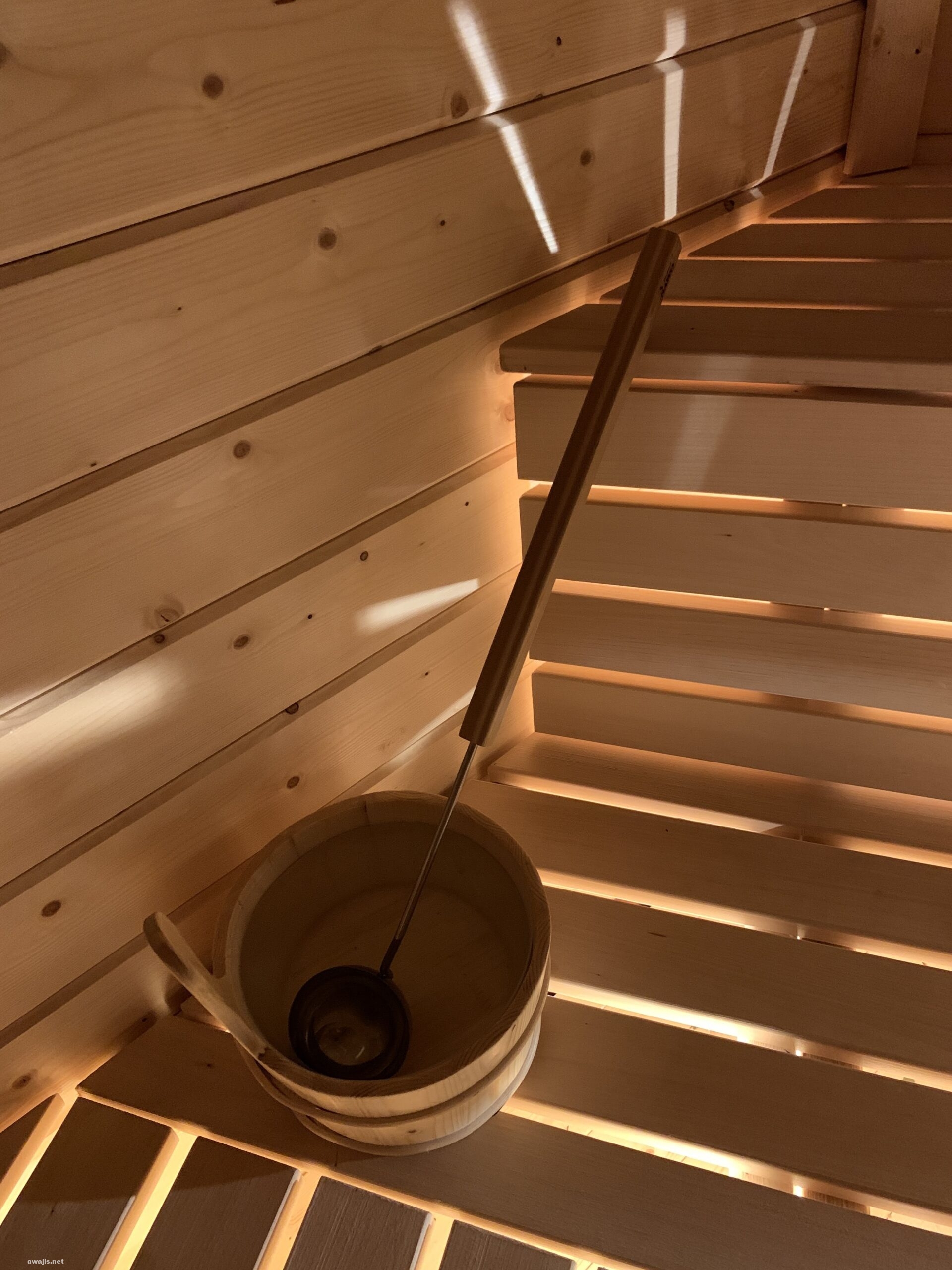 サウナ小屋キットにはサウナ用の桶とひしゃくが含まれていたけど、桶の容量が少ないことと、ひしゃくの長さが短く、すくえる水の量が少なくて不満。
