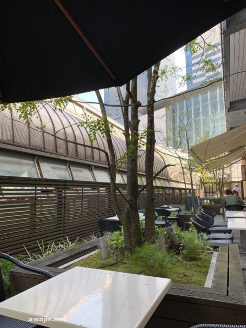 先払いのレジからは店内のカウンター席しか見えないので席があるか心配だったけど、ふと見るとテラス席へのドアが。乗客が忙しく行き来する中央通路沿いに設けられた、緑も多く植えられていて気持ちのいいテラス。JR東提供のWifiも取れる。