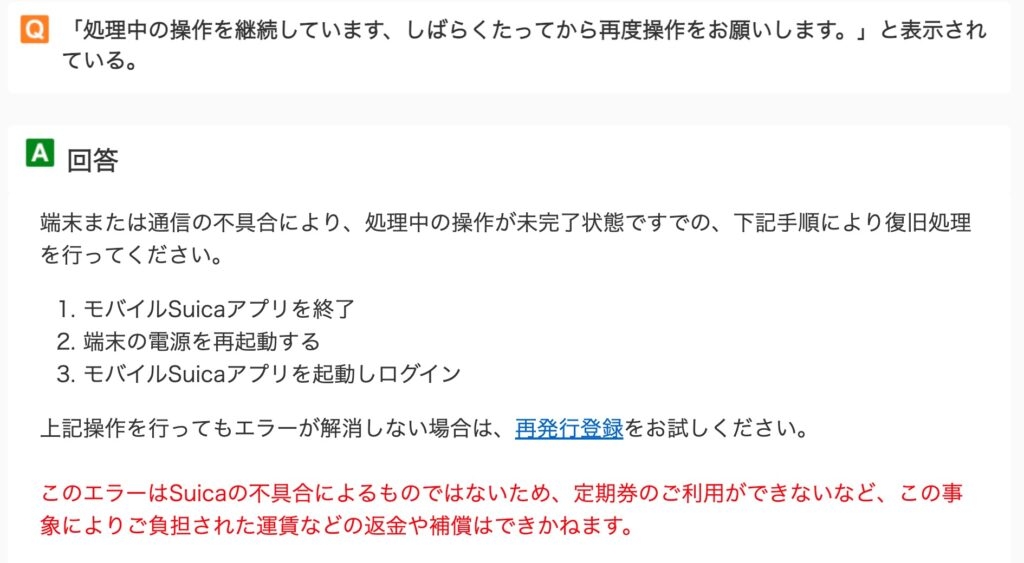 上のページには「このエラーはSuicaの不具合によるものではない」と断じているが、なぜそんな断定ができるのか、理解に苦しむ。エラーのハンドリングが至らないだけだろうが。せめて、次の購入ができるようにでもなっていればユーザが困らなくて済むのに、こんな解説ページに言い訳を書き置いて済ませようとする魂胆がいただけない。