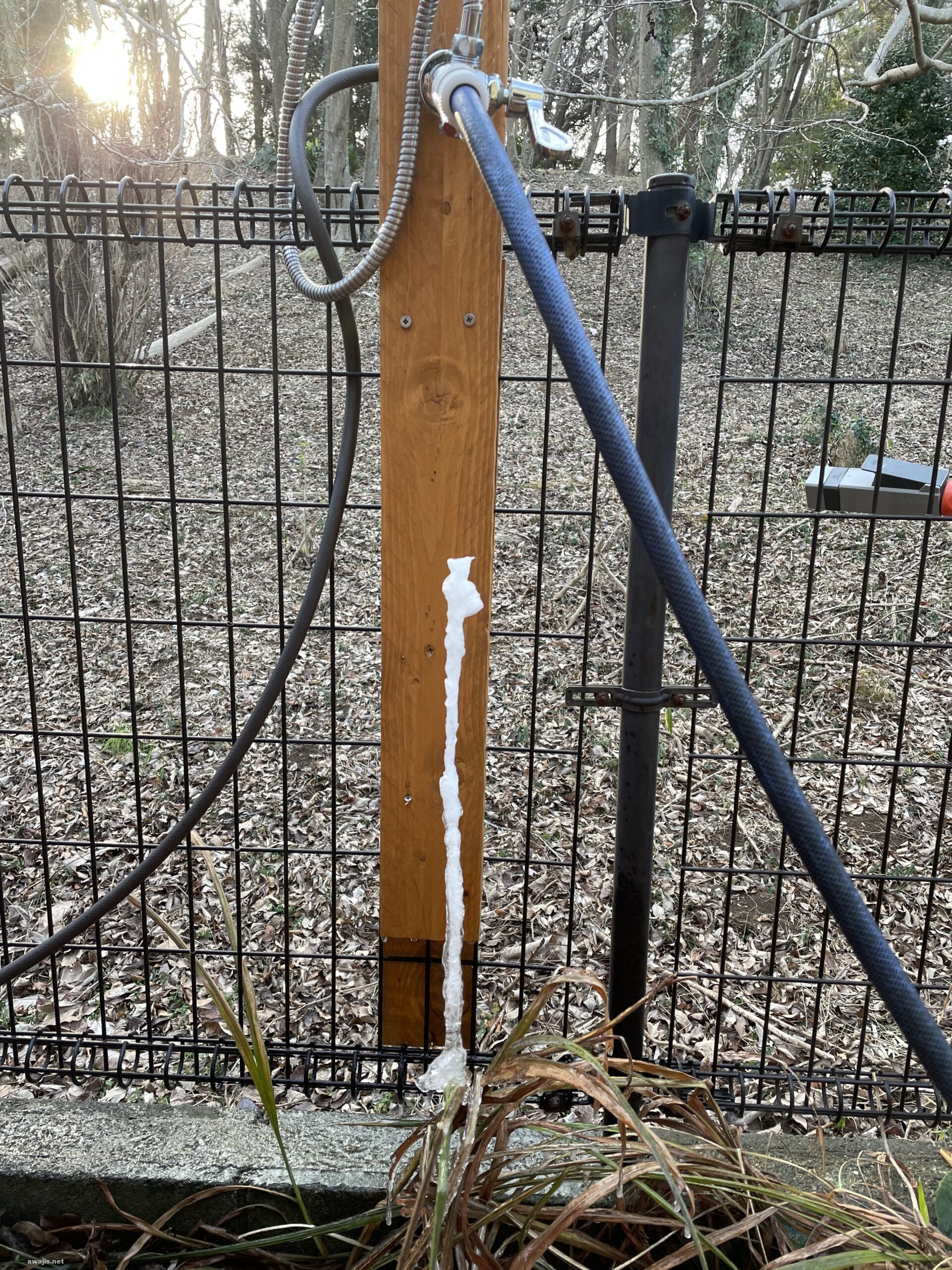 サウナに入り終えたら元の水栓を閉めれば問題ないので、後日修理することにして放置していたところ、息子がサウナを使い終えて、元栓を閉め忘れ、滴った水滴が凍って氷柱になったもの。