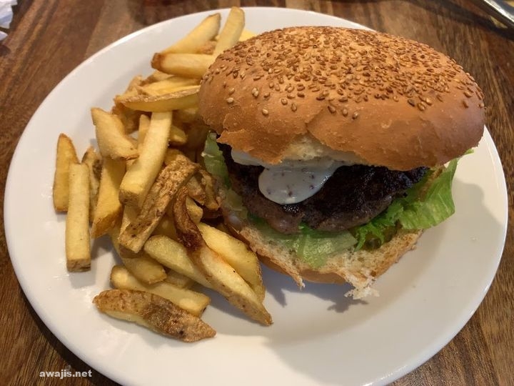 あまりの衝撃でワゴンの画像は取り損ねました。画像は、付属学校の隣にある評判のパブのランチバーガー。サラダビュッフェとコーヒーが付いて11€。月曜は9€です。