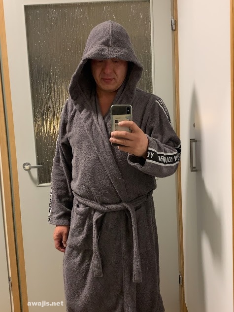 早速スッポンポンの上に羽織り、エレベータで1階のサウナへゴー。バスタオルも必要なく、すごく便利。