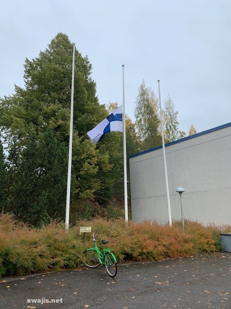 Kuopioでの悲惨な事件を悼んで、今日は市内のあちこちで半旗が掲げられていました。