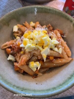 帰りに買い物をし、昼は前夜の魚をトマトソースにしてペンネとあえてランチ。食事係として芸術家をサポート。