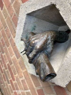 進級や卒業に不安を抱える学生が願をかけるという言い伝えの、壁からにょきっと突き出た、卒業証書を渡してくれる手のアート。