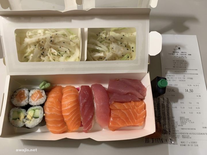 マグロとサーモンのにぎりが2貫ずつ、サーモンとカッパの巻物2つずつ、それにマグロとサーモンの刺身がついて、14,5€。
