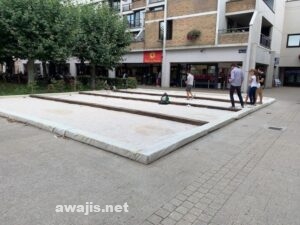 中心部の広場に、ペタンケ場発見。ちゃんと砂が敷いてあって、4レーンもありました。学生と思しきグループがプレーに興じてました。