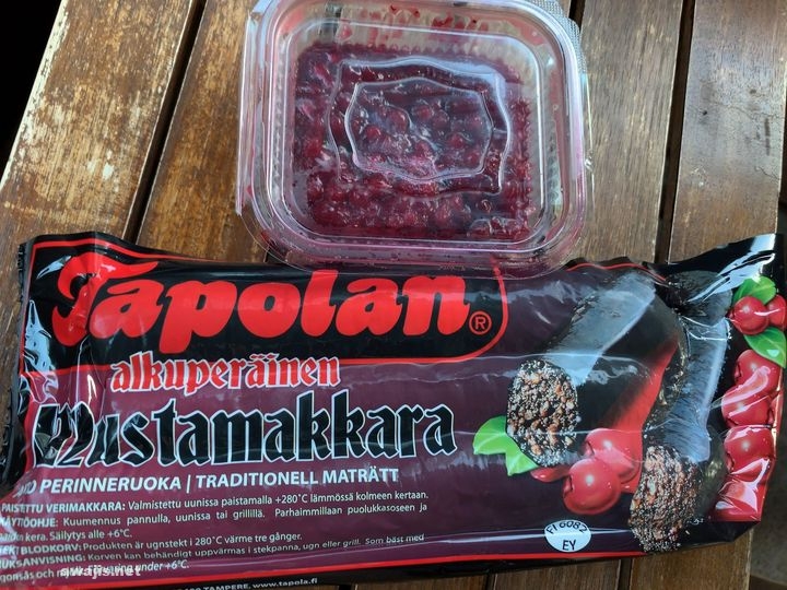 今宵は、タンペレ名物のMustamakkara(mustaは「黒」、makkaraは「ソーセージ」)をグリル。お店特製のリンゴンベリーソース添え。