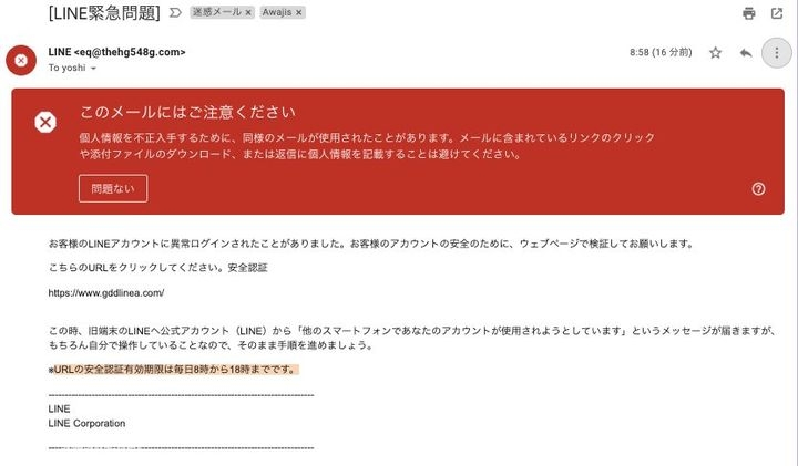 Gmailに迷惑判定される以前に、そもそも「LINE緊急問題」という表現のタイトルでアカンと思うけど、傑作なのは誘導していくリンク先の対応。