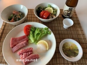 お品書き:中トロとホタテの刺身、マグロとネギとわかめのぬた、キュウリとわかめとトマトとキノコの酢の物。