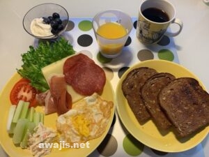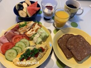 高校のクラスメートが、世界のあちこちから、やれパンが多いだとか、チーズの種類増やせとか、スイカがないとか、いろいろ厳しい意見をくれたおかげで、とても充実した朝食に(批評をいただいた昨日の朝食の写真も参考まで)。