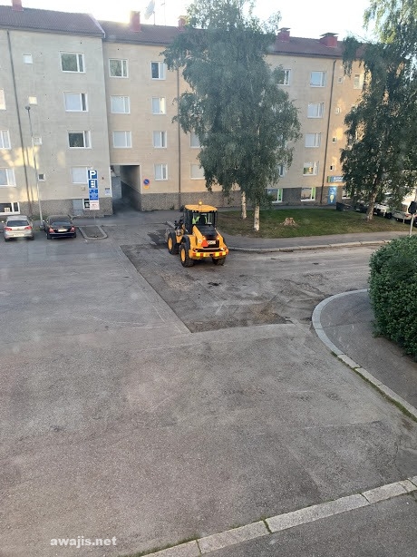 工事の音が妙にうるさいので、表通りの路面電車の線路敷設工事が切羽詰まっているのかと思ったら、アパートの駐車場の舗装工事。