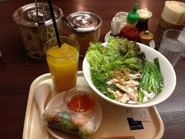 選んだのは、Com Phoセット980円(お好みのPho、生春巻き、ドリンクのセット)。フォーは鶏を選択、ドリンクはとろーりのマンゴージュースを選択。生春巻きもしっかり巻いてあっておいしい。