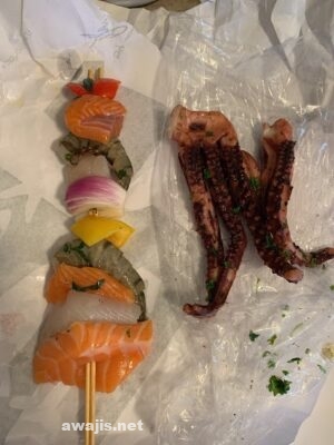 刺身は諦め、いろんな魚介と野菜の串刺しと、ゲソ、いずれもオリーブオイルで下味つけてあるのを買ってきて、グリルで焼いて晩酌。