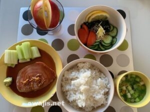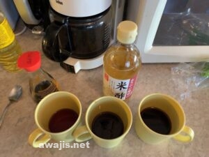 小さいボールがないので、酢の物の三杯酢と、照り焼きのタレを別々のコーヒーカップで準備しました。迂闊なことに、コーヒーも飲みながら料理していたので、うっかり照り焼きのタレを飲みかけてびっくり仰天。