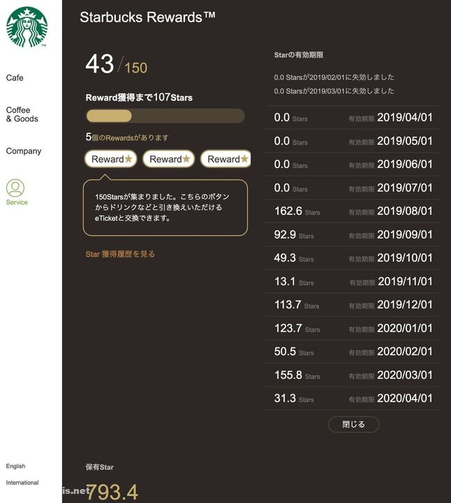 2)Rewardに交換せず放置しておくと、古いスターからどんどん有効期限が切れて失効していく